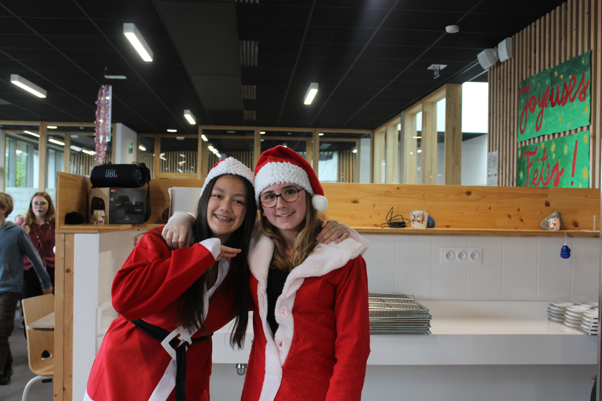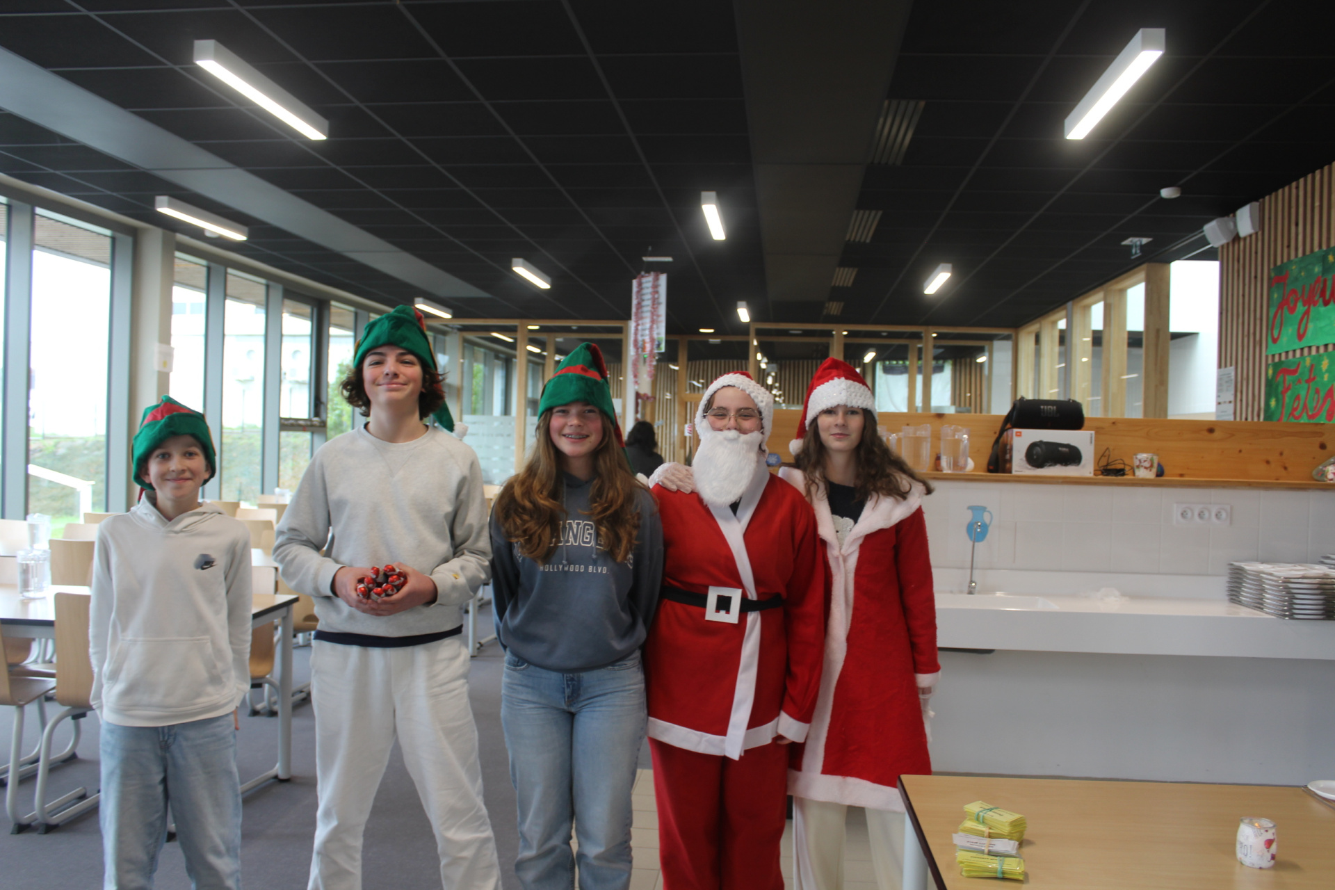 A l’arrivée des élèves, l’ambiance était déjà festive : la sonnerie chantait l’air de « Jingle Bells », le hall était décoré, et notre CPE avait même mis des lunettes en forme de sapin !