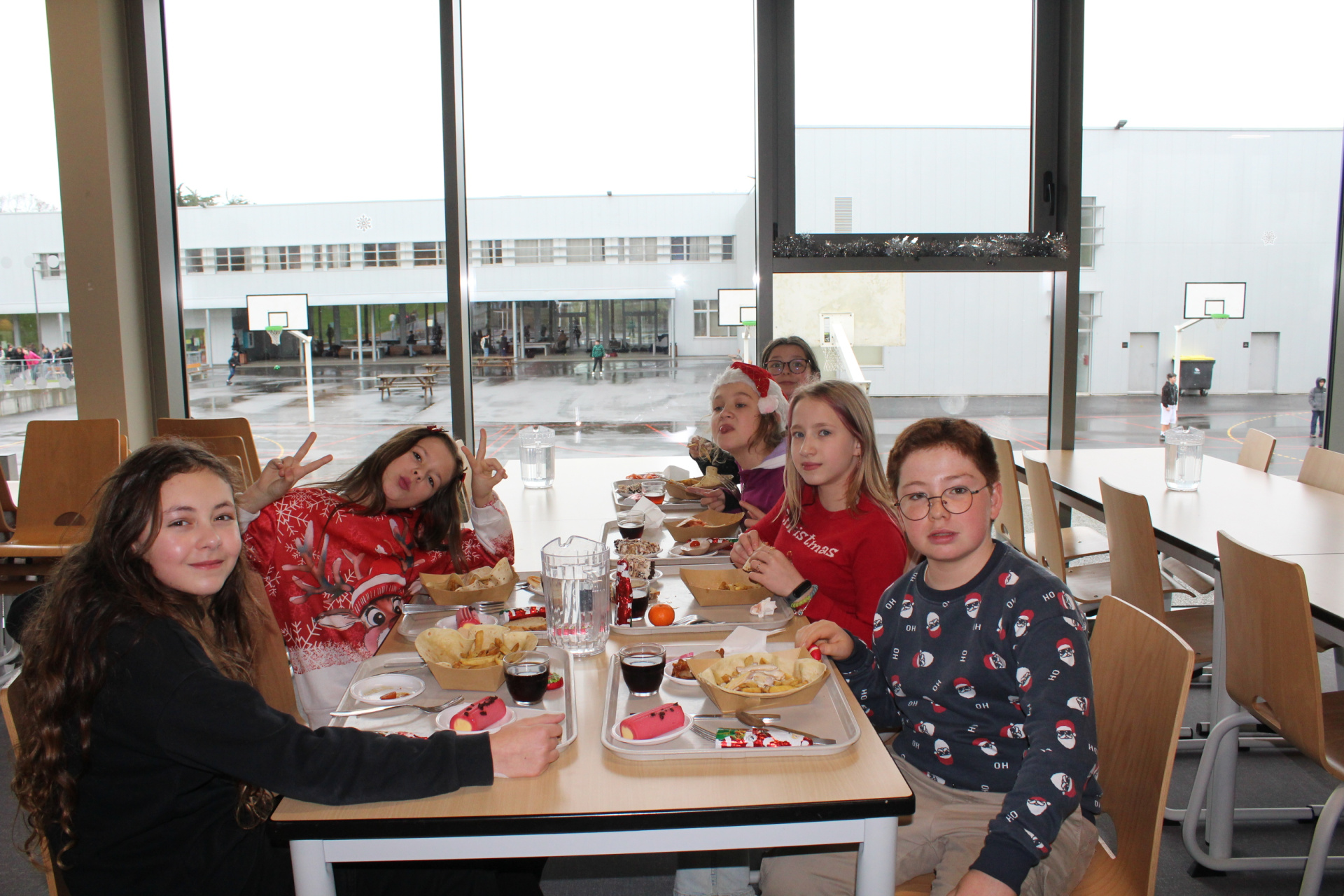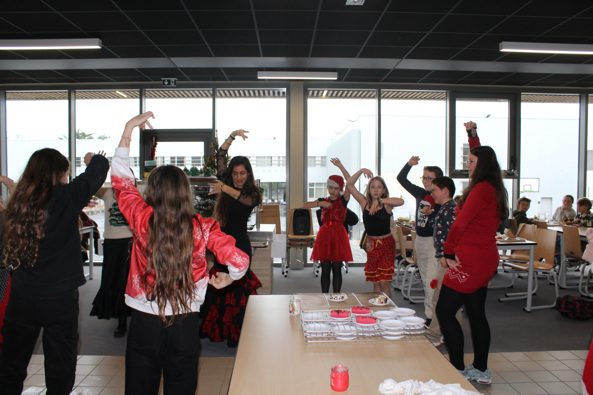 Plus tôt dans l’année, les élèves avaient pu choisir le menu du jour grâce à une boîte à idées dans le self : le chef avait donc préparé de délicieux tacos que l’on pouvait garnir nous-mêmes, des frites, et, en dessert, de la bûche glacée ou une forêt noire. Des élèves déguisés faisaient l’animation : des lutins servaient les boissons, la mère Noël s’occupait des desserts et le père Noël distribuait des chocolats ! Clou du spectacle : le club de Flamenco a fait une super chorégraphie en tenue. Bref, UNE SUPER JOURNÉE !!! Merci Erika d’avoir pris des photos et immortalisé les plus beaux pulls de Noël !